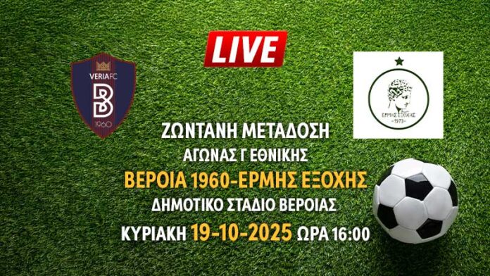 Παρακολουθήστε ζωντανά από τον ΕΜΒΟΛΟ τον αγώνα Γ Εθνικής μεταξύ ΒΕΡΟΙΑ 1960 – Ερμής Εξοχής που θα διεξαχθεί στο Δημοτικό στάδιο Βέροιας την Κυριακή 19-10-2025 και ώρα 16:00
