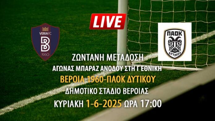 Παρακολουθήστε ζωντανά από τον ΕΜΒΟΛΟ τον αγώνα μπαράζ ανόδου στη Γ Εθνική μεταξύ ΒΕΡΟΙΑ 1960-ΠΑΟΚ ΔΥΤΙΚΟΥ που θα διεξαχθεί στο Δημοτικό στάδιο Βέροιας την Κυριακή 1-6-2025 και ώρα 17:00