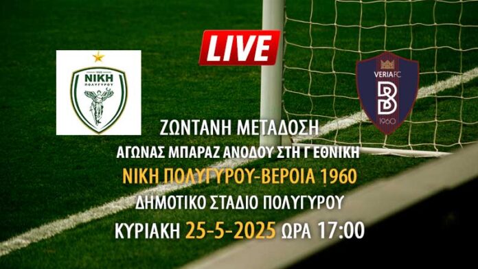 Παρακολουθήστε ζωντανά από τον ΕΜΒΟΛΟ τον αγώνα μπαράζ ανόδου στη Γ Εθνική μεταξύ ΝΙΚΗ ΠΟΛΥΓΥΡΟΥ-ΒΕΡΟΙΑ 1960 που θα διεξαχθεί στο Δημοτικό στάδιο Πολυγύρου την Κυριακή 25-5-2025 και ώρα 17:00