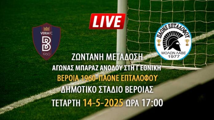 Παρακολουθήστε ζωντανά από τον ΕΜΒΟΛΟ τον αγώνα μπαράζ ανόδου στη Γ Εθνική μεταξύ ΒΕΡΟΙΑ 1960-ΠΑΟΝΕ ΕΠΤΑΛΟΦΟΥ που θα διεξαχθεί στο Δημοτικό στάδιο Βέροιας την Τετάρτη 14-5-2025 και ώρα 17:00